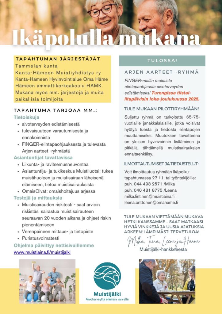 Janakkalan pääkirjastolla 16.9.2025 järjestetty Ikäpolku-tilaisuus kokosi yhteen janakkalalaisia toimijoita hyvinvoinnin ja terveyden saralta. Muistijälki -hankkeen järjestämässä tilaisuudessa kuultiin tietoiskut tulevaisuuteen varautumisesta, aivoterveyden edistämisestä sekä Finger-elintapaohjauksen pilottiryhmästä, joka on alkamassa Janakkalassa. Eri toimintapisteillä oli tietoa ravitsemuksesta, puristusvoimasta, muistisairauksien riskitestistä, muistiluotsitoiminnasta sekä useiden yhdistystoimijoiden ja yritysten toiminnasta. Tilaisuuteen kutsuttiin henkilökohtaisella kutsukirjeellä kaikki kuluvan vuoden aikana 70-vuotta täyttävät janakkalalaiset läheisineen. Osallistujapalaute oli kiittävää ja vastaavanlaisia matalan kynnyksen tilaisuuksia toivottiin lisää. Myös toimintaansa esitelleet paikalliset yhdistykset ja yritykset kokivat tilaisuuden antoisana.
