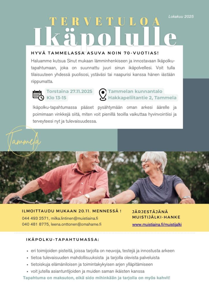 Kutsu Ikäpolku-tapahtumaan saapuu postitse kaikille Tammelassa asuville tänä vuonna 70 vuotta täyttäneille ja täyttäville. Olet siis lämpimästi tervetullut mukaan juuri sinulle ja läheisellesi suunnattuun tapahtumaan torstaina 27.11.2025 klo 13.00-15.00 Tammelan kunnantalon valtuustosaliin.